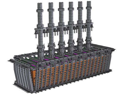 自主開發的專利產品,由倒梯形爐體結構、整體彈性骨架及電極裝置組成,RKEF火法煉鎳鐵的核心設備。